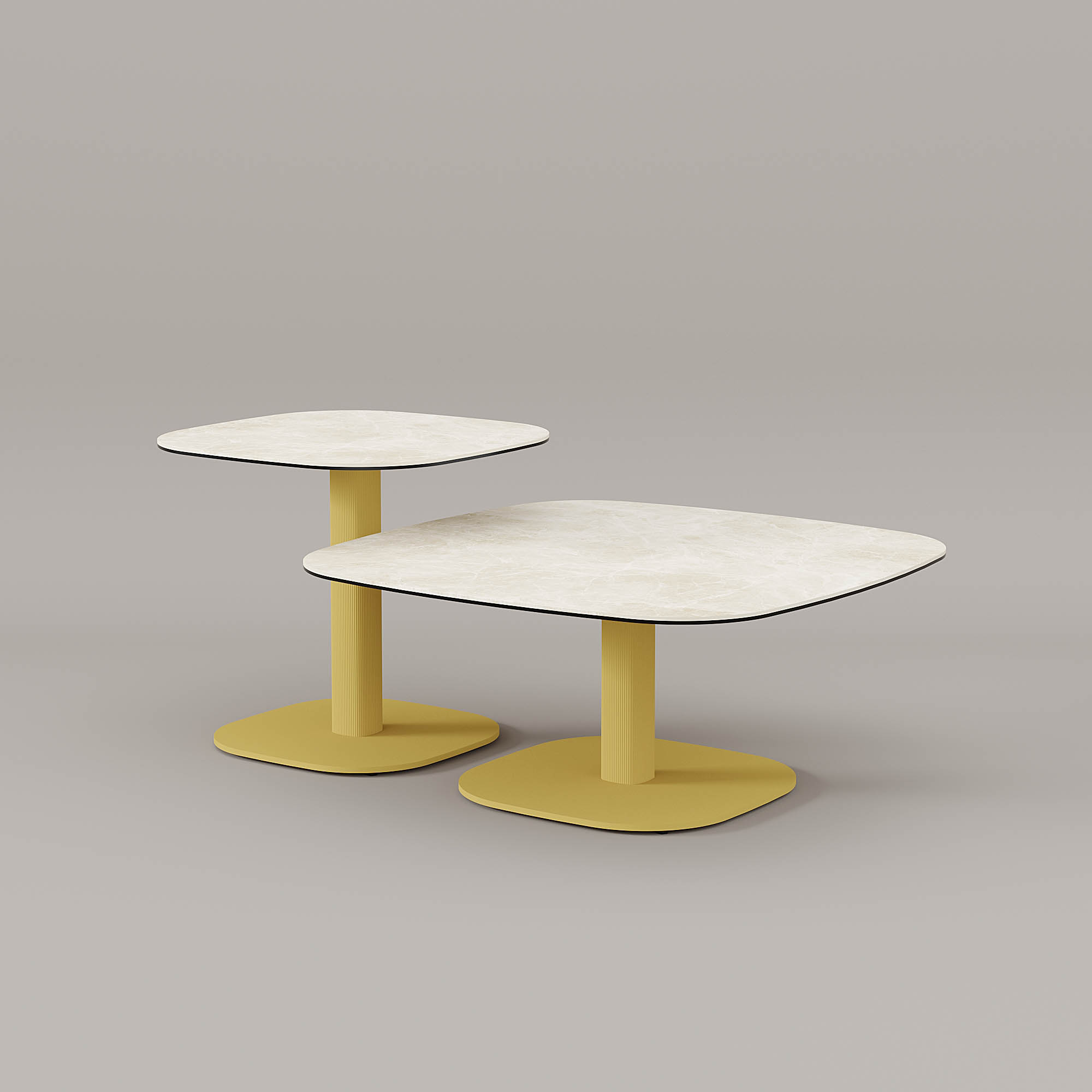 Die Kollektion umfasst Tische und Beistelltische mit Mittelfuß in 6 verschiedenen Höhen sowie Tische mit doppeltem Mittelfuß.