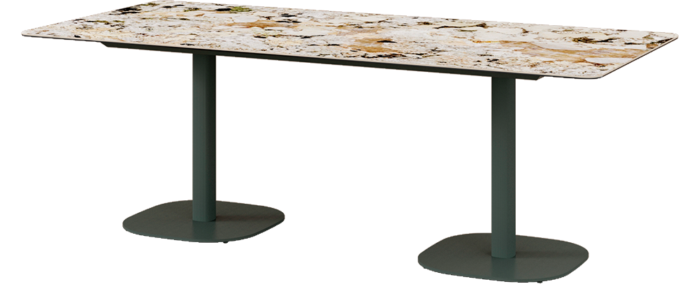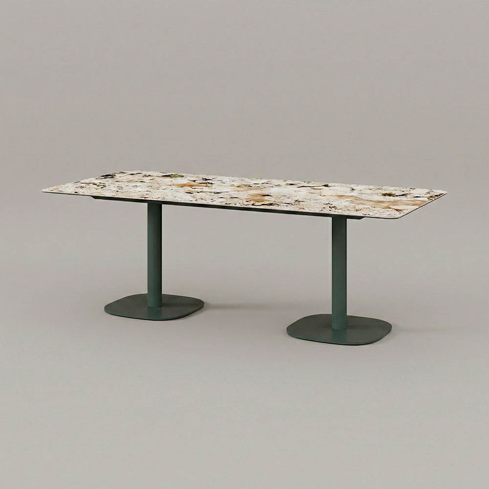 The steel base ensures stability and strength, while the technical ceramic tabletop, a distinctive hallmark of the brand, guarantees durability and versatility for both outdoor and indoor spaces.